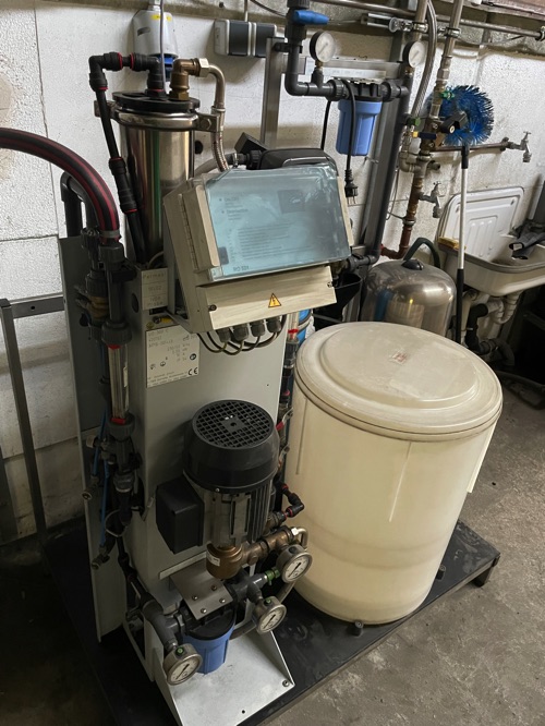 Vorratstank Reinigen ca. 1500 l mit Wärmedämmung/Heizung, Pumpeneinheit zur Druckerhöhung, Hochdruckreiniger, Ölabscheider, Filtergehäuse VA